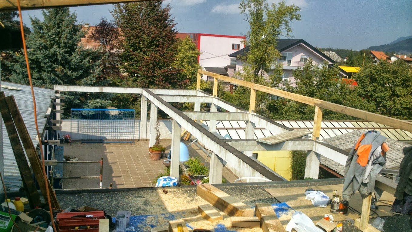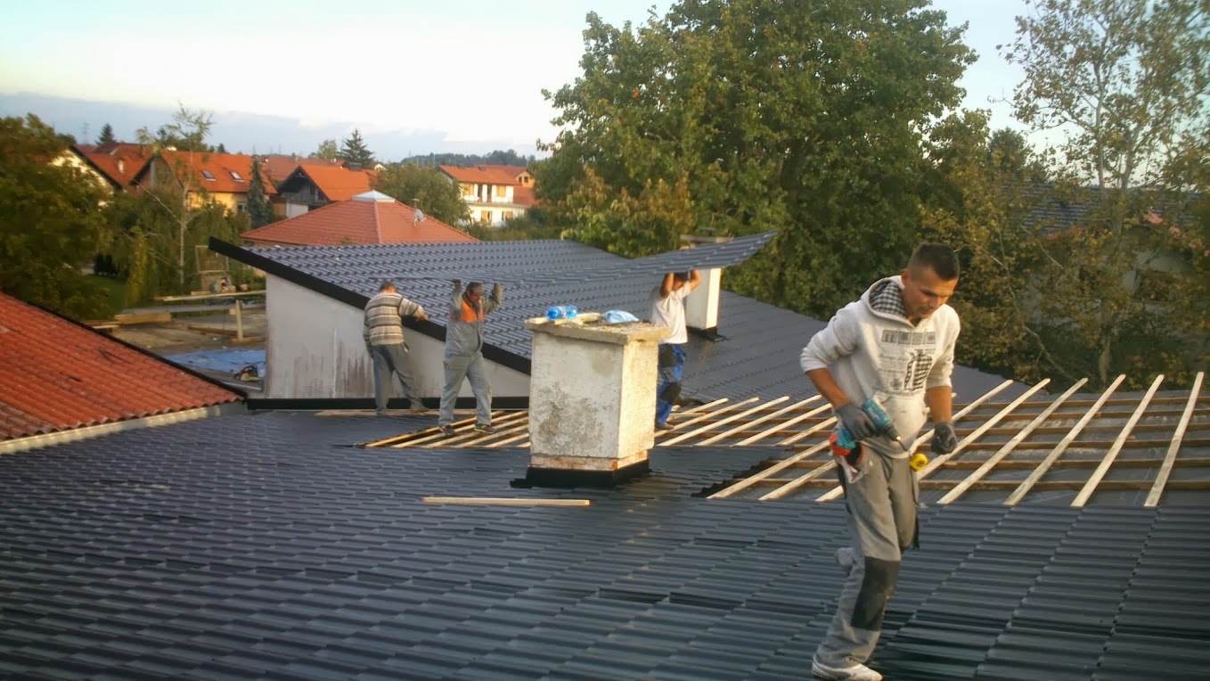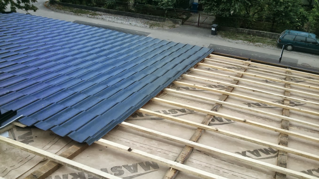 Demontaža salonit ploča na dvije postojeće plohe i montaža crijep ploče Lindab ispod koje je položena paropropusna folija 140g/m2 preko rogova . Korišterna letva 4x5 i kontra gredice za zračni prostor 5x8 cm. Izgradnja novog krovišta iznad terase od greda 10x14 i na njih je postavljen stari pokrov u obliku crijep ploče koja ima poliuretansku ispunu ,zaštićenu alunijskom folijom.